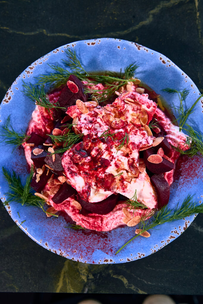 Roasted Red Beets on Whipped Goat Yogurt with Walnuts & Pomegranate Syrup