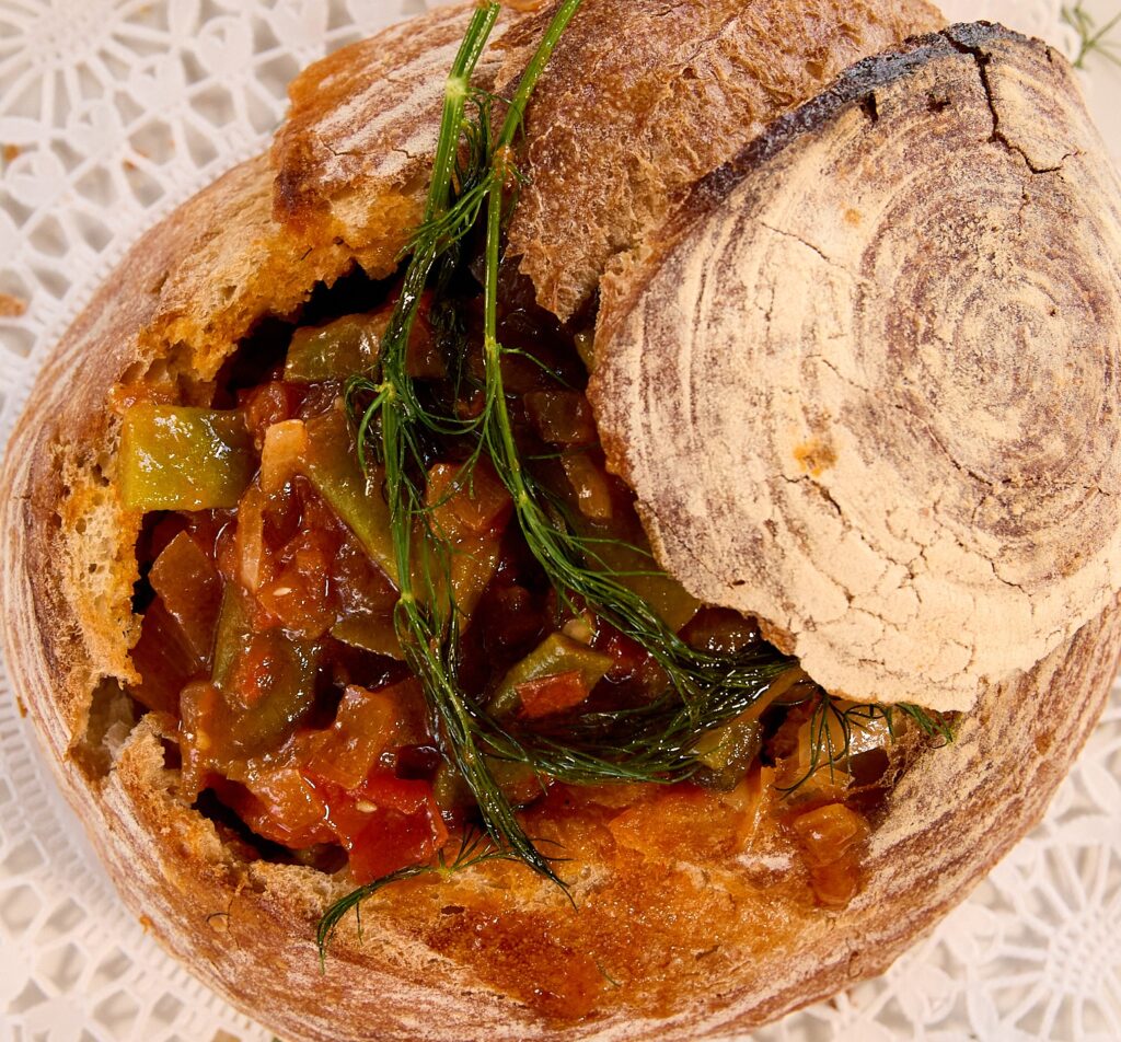 In autumn, I love letting flat green beans simmer in olive oil, garlic, and tomatoes, then serving them in a toasted round bread bowl. There’s something special about sharing vegetables this way—simple, warm, and full of the season’s harvest.