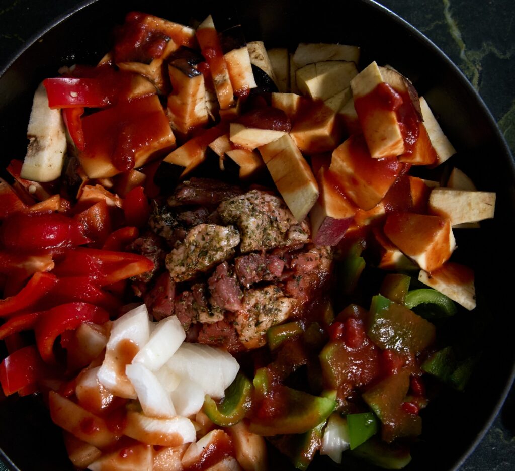As the cold weather comes, the lamb and vegetables roast in a cast iron skillet, their colors glowing like holiday lights. The aromas of paprika, oregano, and mint fill the air, while golden garlic cloves peek through. Served straight from the skillet, this one pan dish is a warm, festive centerpiece bringing comfort, love, and the joy of sharing a home-cooked meal.
